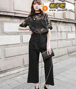 4透视上衣搭配示范四:黑色花朵透视短袖上衣+黑色九分阔腿裤+黑色尖头高跟鞋+黑色链条包,黑色透视总给人一种神秘性感的美,搭配九分阔腿裤倍有御姐范,尖头高跟鞋和链条包时尚有型。