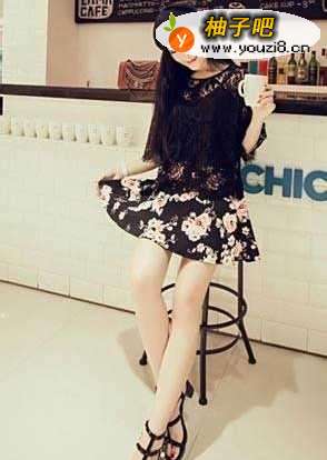3透视上衣搭配示范三:黑色蕾丝透视上衣+黑色高腰花朵裙+黑色铆钉凉鞋,柔美性感的蕾丝上衣,肩部的透视露出肉色,显得非常白皙性感,搭配黑色花朵裙,又增加几分柔美小清新。