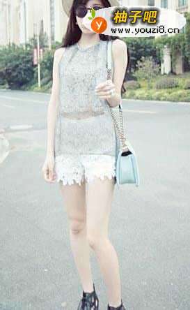 6透视上衣搭配示范六:灰色蕾丝透视无袖上衣+白色蕾丝短裤+黑色凉鞋+蓝色链条包,无袖蕾丝衫显瘦有气质,腰部的透视微微露出肚脐,打造女生小性感,搭配白色蕾丝短裤柔美好看。