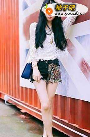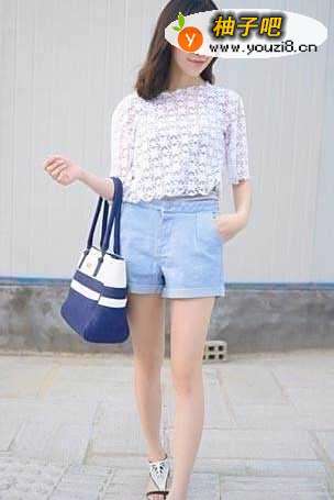 5透视上衣搭配示范五:白色蕾丝透视短袖上衣+蓝色短裤+平底凉鞋+蓝白拼色手提包,柔美的蕾丝若隐若现透出内衣,给人一种朦胧的美感,搭配蓝色短裤和蓝色手提包,给人柔美清新的气质。