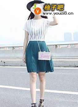 7透视上衣搭配示范七:白色条纹透视短袖上衣+墨绿色百褶短裙+黑色凉鞋+银色链条包,没有蕾丝花朵的柔美,竖条纹的透视上衣显得更加清爽简洁,搭配墨绿色短裙,简单搭配最舒服。