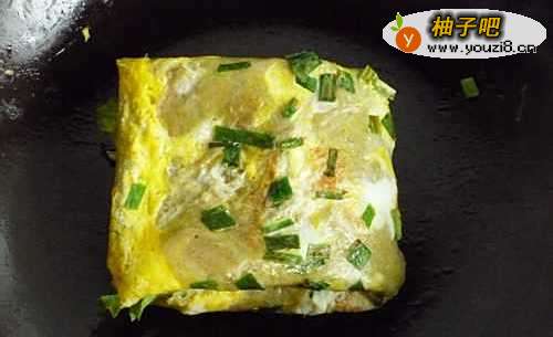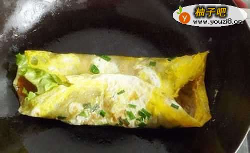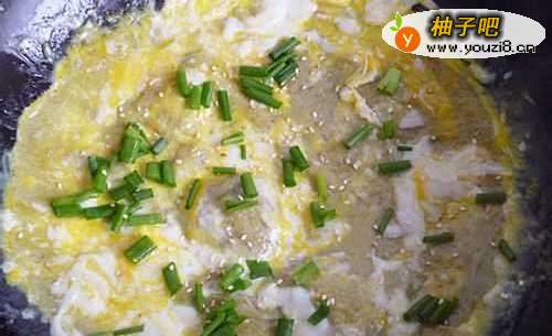 6把鸡蛋摊开,撒上芝麻,葱花。