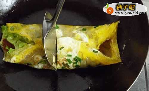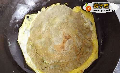 7煎饼四边翘起,鸡蛋凝固,翻面。