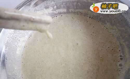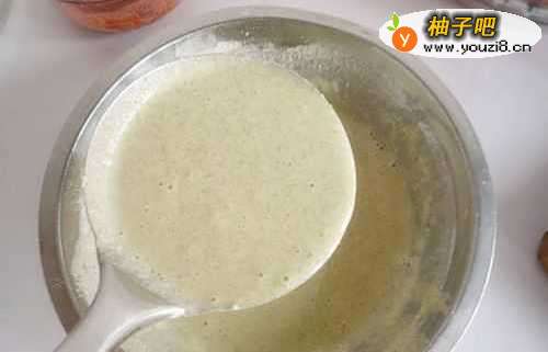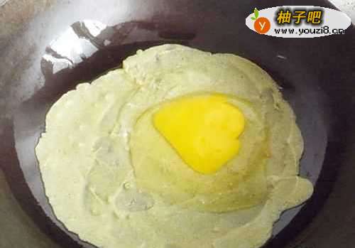 4取一大汤匙的量,放入平底锅中摊开成面饼。(锅底稍稍抹一层油,油千万不能多)