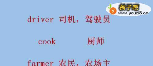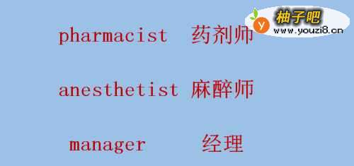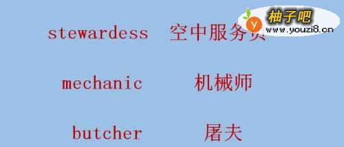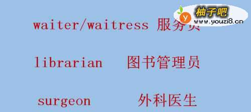 今天一起学习关于职业名称的单词:waiter/waitress服务员、 librarian图书管理员、 surgeon 外科医生、pharmacist药剂师、 anesthetist 麻醉师 、manager经理、governor政府官员、 President总统、 policeman 警察、policewoman 女警察、 waiter 服务员、 waitress女服务员、driver 司机,驾驶员、 cook 厨师、 farmer 农民,农场主、stewardess 空中服务员、 mechanic 机械师、 butcher 屠夫。