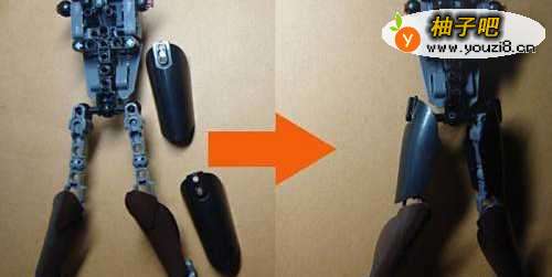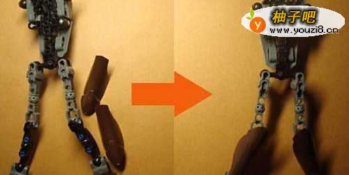 3接着,拼装人物模型躯干支架部分的小腿护板部分。由两个小腿护板积木和两个轴零件积木所组成。左边是拼装所需的零件,右边是拼装好后的整体结构效果,如下图所示。