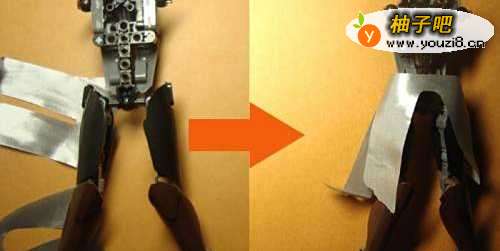 5接着,拼装人物模型躯干支架部分的衣服部分。由一个衣服的布料和一个轴零件积木所组成。左边是拼装所需的零件,右边是拼装好后的整体结构效果,如下图所示。