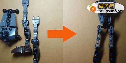 2这里,先搭建人物模型躯干支架部分的主轴支架,由两个主轴支架积木和腿脚积木所组成。左边是拼装所需的零件,右边是拼装好后的整体结构效果,如下图所示。