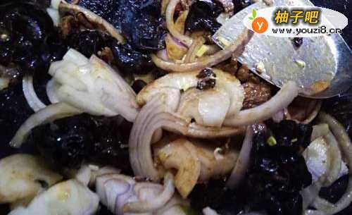 6然后,将肤闲准备好的洋葱和木耳倒入锅中,继续翻炒均匀,一直翻炒到洋葱色稍有变深(约1分钟),即可关火。盛出盘中,上桌稍停可食用。