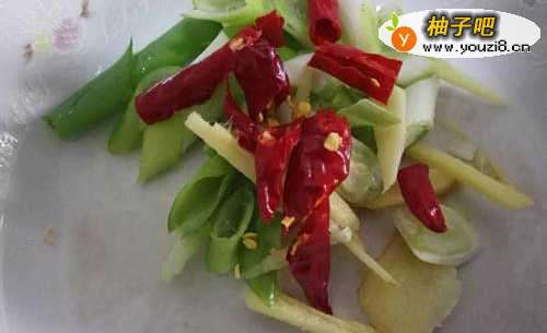 3然后,将洗好的葱切成斜段,将姜切成粗姜丝,将红尖椒也切成小斜段。待用。