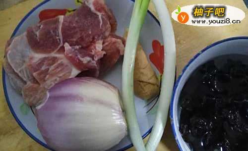 准备食材:将洋葱、葱剥好冲洗干净,将姜块和红尖椒也冲洗干净,将干木耳泡在碗中,将瘦肉块从冰箱中取出。