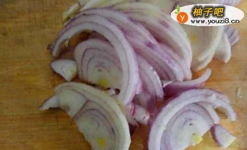 4将洋葱横着切成洋葱片,自然就会成为半圆的洋葱丝;将木耳发开后,用手搓一搓,冲洗干净,最好在开水中焯一焯。待用。