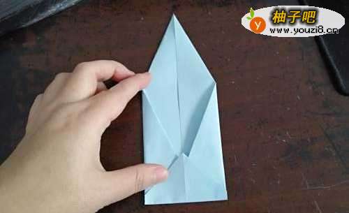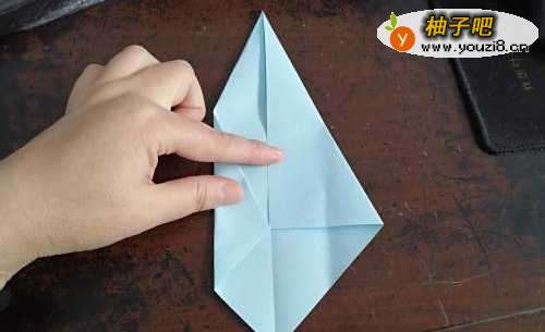 5还是刚才的角,把角向上折,如图一。然后打开彩纸,按照折痕把边折到两侧,如图二。