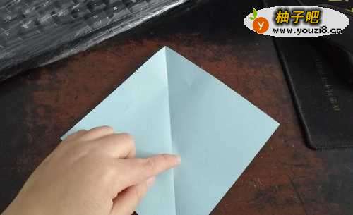 3把下侧的角向上折,然后再把彩纸从中间对折,如图。