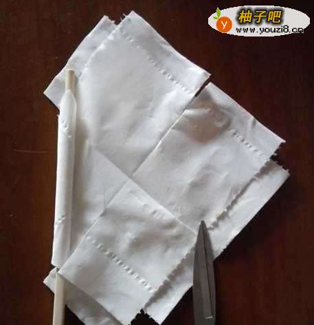 4剪开后,卫生纸的四角用筷子沿对角卷在筷子上。