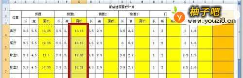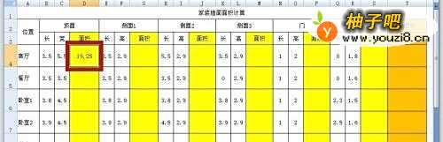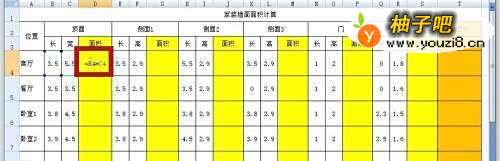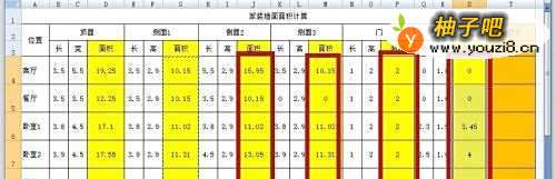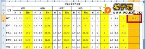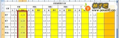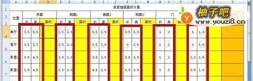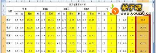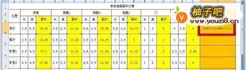 8重复以上第5-6步骤,则将D4至D8单元格的公式复制至如图框中的单元格内,则侧面2、侧面3,以及门窗的面积同时都计算出来了。