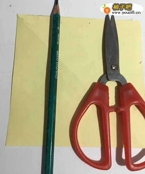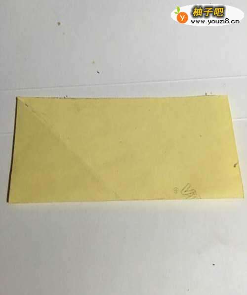 第一步 把一张16厘米X16厘米的正方形黄色彩纸 从下向上对边折叠整齐