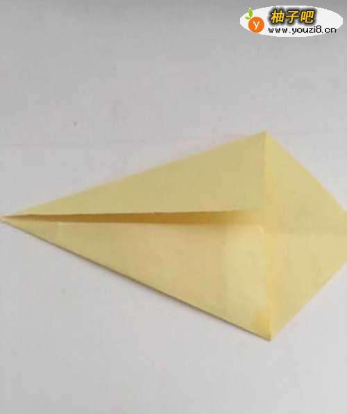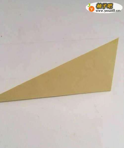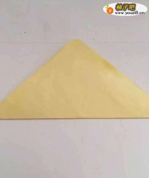第一步 把一张14厘米X14厘米的正方形黄色彩纸 从下向上对角折叠整齐