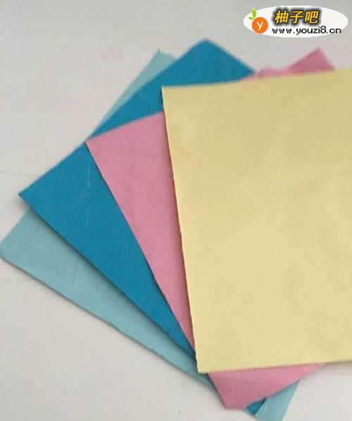 5第五步 折叠完之后 再以同样的方法步骤折叠另外三种颜色的彩纸 然后按顺序摆放在一起