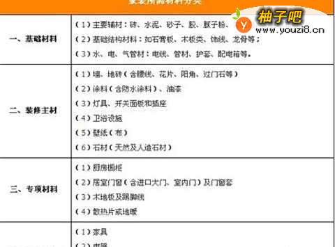 确定家装所需材料一般家居装修所需的材料可以分成基础材料、主要材料、专项材料以及配套材料四大类。可以参照下表中的比较详细的材料分类,再根据自家的装修方案,添加删减所需材料,从而制定所需材料清单。