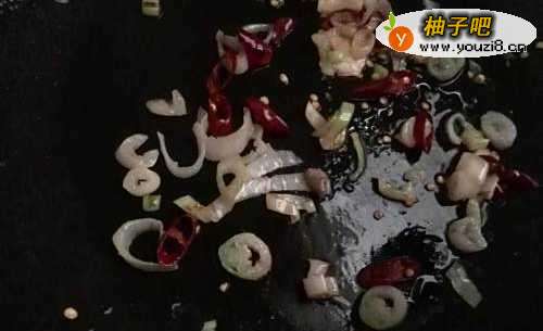 3放适量的调和油将葱及红辣椒至炒锅中翻炒出味儿。