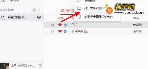 5下载完毕后点击我喜欢的音乐右键点击歌曲,选择打开文件所在目录。