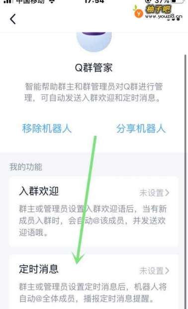 1、群聊页面中选择右上角的三杠选项,选择群机器人选项2、选择Q群管家功能,选择定时消息选项3、选择添加消息提醒选项,根据自己可以以普通消息、通话预定选项卡为消息提醒,还可以调整提醒的时间、重复选项后选择完成选项。