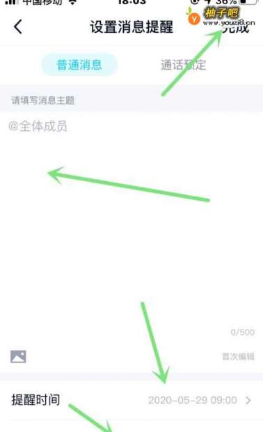 6打开设置消息提醒页面中根据自己可以以普通消息、通话预定选项卡为消息提醒,还可以调整提醒的时间、重复选项后选择完成选项。