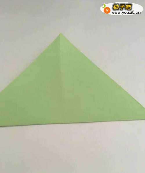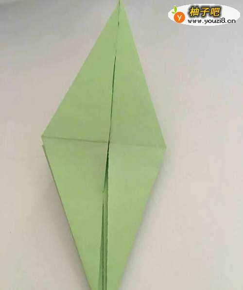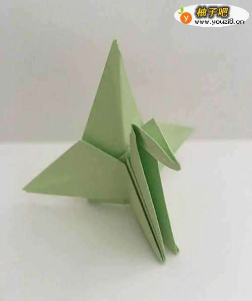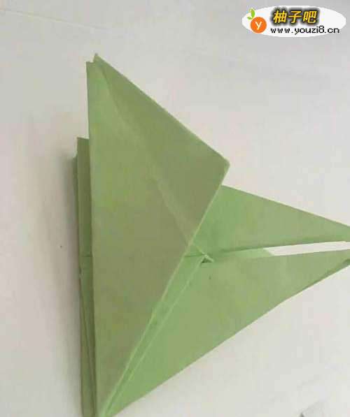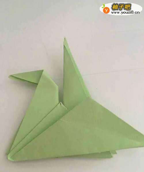 5第五步 折叠完之后 左右翻过来 再掀起来左边的上层角 向上标齐底层折叠 然后把两个尖角竖起来向上 左边那个尖角折叠出纸鹤的头部