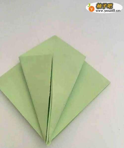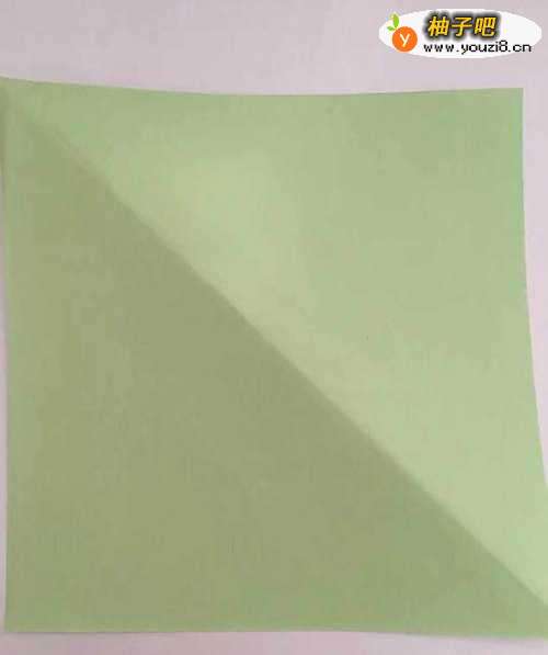 第一步 把一张16厘米的正方形粉绿色彩纸 对角对边各折两次 然后向当中聚拢 折叠一个小双正方形
