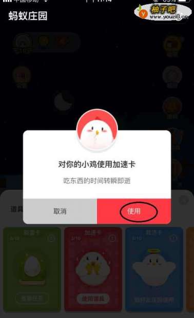5然后再弹出对小鸡的加速卡的对话框中点击“使用”选项。
