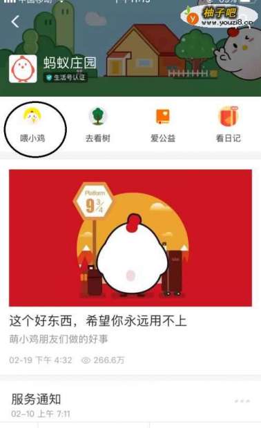 2然后打开蚂蚁庄园生活号界面中选择“喂小鸡”选项。