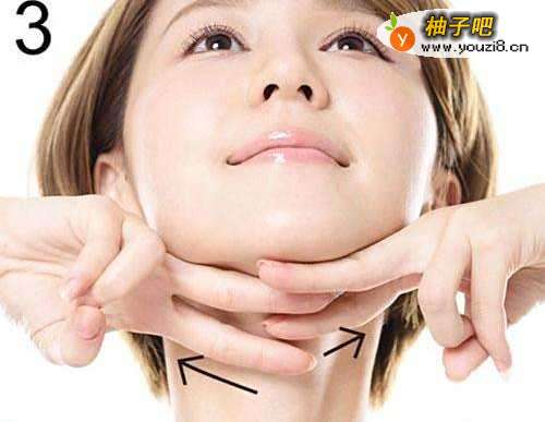 食指和中指将下巴赘肉夹起来,往脸颊两侧移动,左右各3次。