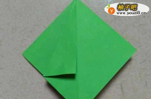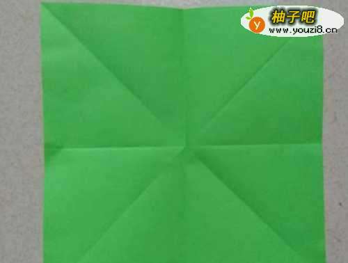 2第二步:以闭口一端为顶角,取一个角向中线翻折,然后展开,再把这个角撑开并向下压平;余下三个角折法相同。
