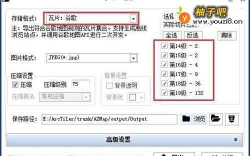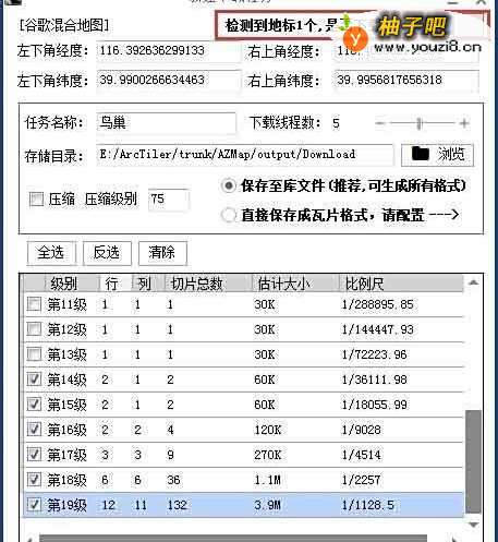 在窗口上方,您会看到提示是否下载地标,选择【是】,然后选择【库文件格式】,配置下载的卫片级别,选择14-19,点【确定】开始下载。