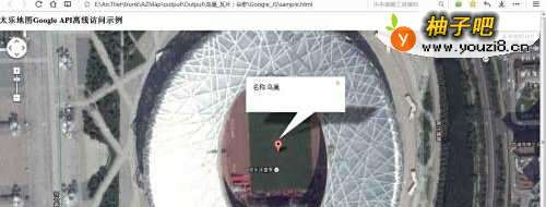 9等待导出完成,【太乐地图下载器】会自动构建离线浏览站点,并弹出站点页面,您可以看到之前绘制的鸟巢地标,不偏不倚的也在离线地图站点中自动绘制出来了:)