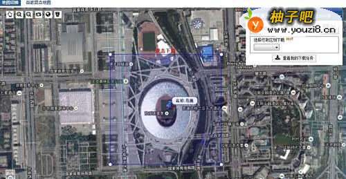 在右上方快捷工具栏中选择下载方式(有画框下载、画多边形下载、读取Kml下载、按行政区划下载多种方式),这里选择画框下载,然后将鸟巢框选进去。