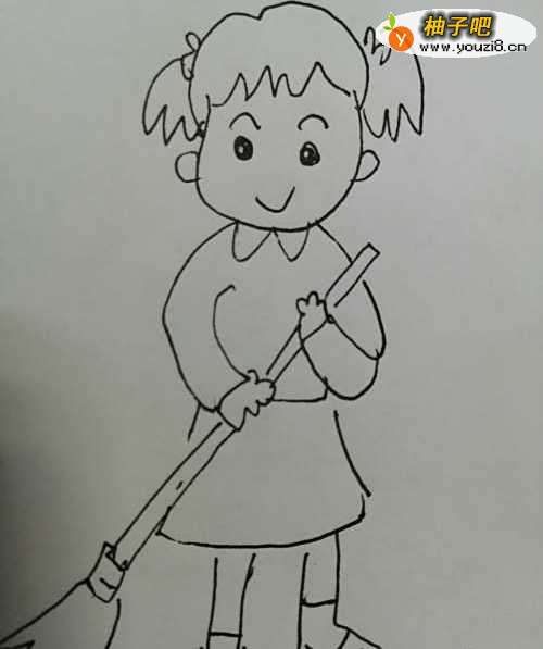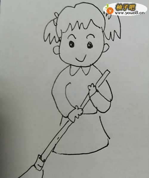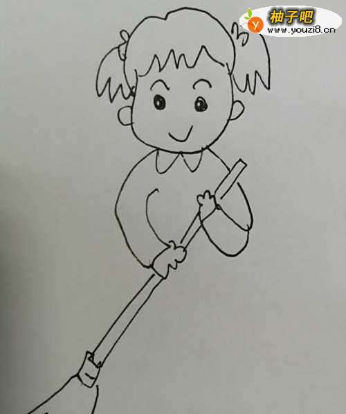 5第五步,然后在小女孩的小手上画出一个简单的扫帚,注意扫帚细节的画法。