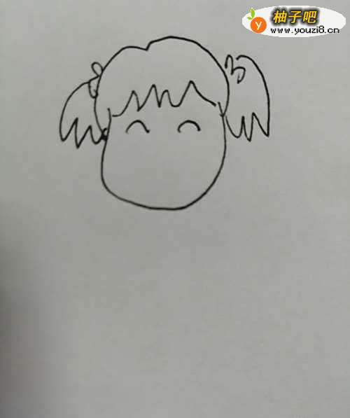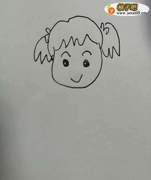 第一步,我们先把小女孩的脸和头发画出来,注意小女孩头上的两个小辫子的画法。