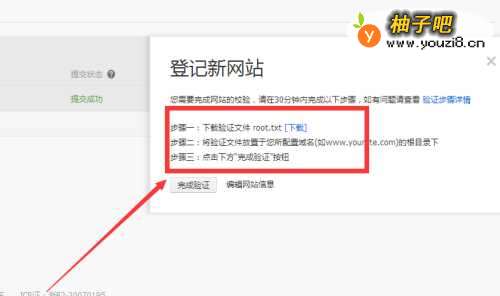 8按照提示步骤,将验证文件下载下来上传到网站根目录,进行验证