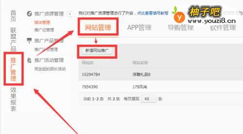 5打开后,依次打开推广管理-》网站管理-》新增网站推广