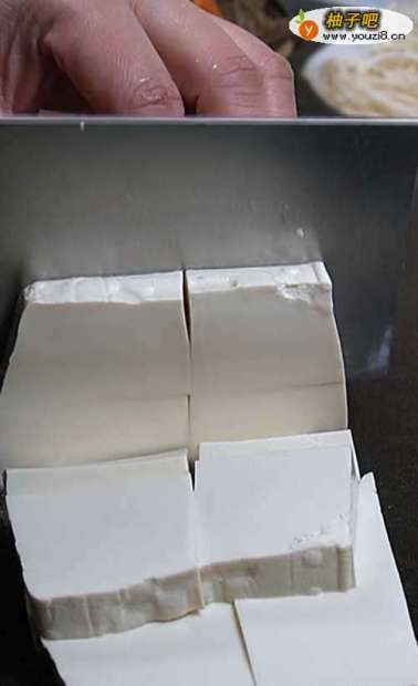 首先准备嫩豆腐一块,改刀成4方块,厚度大概一厘米即可