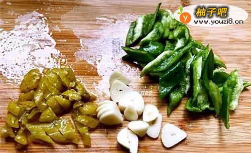 2把青椒、大蒜和艳趣泡椒分别清眠盲洗干净侧距召。将青椒斜切成大块,大蒜切片,泡椒切成小段,如图所示;