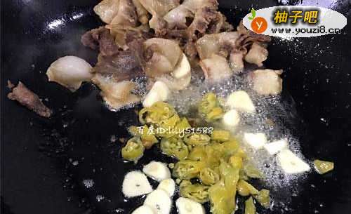 5煎过五花肉的油比较多的,先倒一点出来,然后把泡椒和蒜片放进锅里炒出香味。