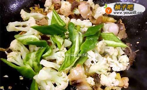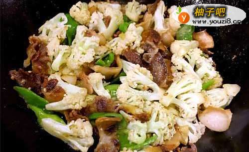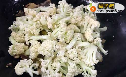 6放入花菜炒2分钟,因为花菜是没有焯水的,比其他菜炒的时间稍为长一点。
