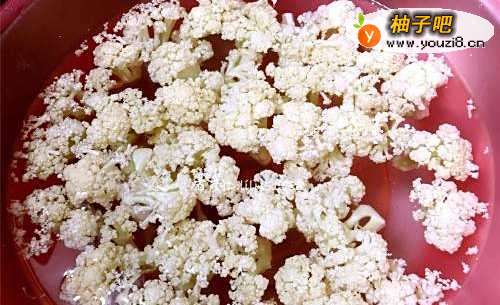 把花菜切小块,放入清水里洗干净,装盘中备用。