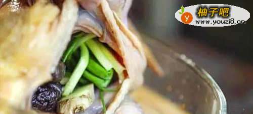 3干香菇用温水泡开,泡软。把准备好的小葱洗干净后捆成结,和姜片一起塞到鸡肚子里。