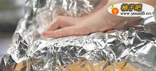 5荷叶包好之后,我们用锡纸再包一层。这样也可以达到黄泥锁住荷叶和鸡香味的作用。一定要包的严实。