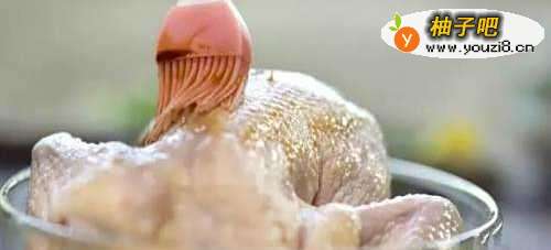 2按摩3分钟左右,盐被吸收了一些之后,可以用刷子给鸡刷一层黄酒,再刷一层老抽