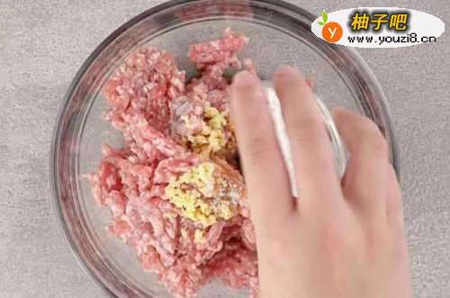 2肉馅中放入姜末、老抽、生抽、盐、淀粉、鸡蛋,搅拌上劲儿,放入葱花和香油,然后搅拌均匀。